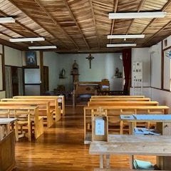 芦花部教会の拝殿上部には,丸に十の字の島津家家紋が据えられています。