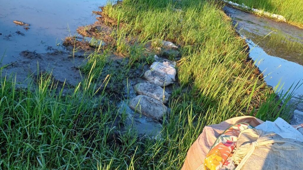 田んぼを再生できたら、水をためないといけませんが、湿地帯の田んぼの畦道はふにゃふにゃのぐちゃぐちゃです。土?いや,泥を盛っても沈んでしまうため,畦になりません。
