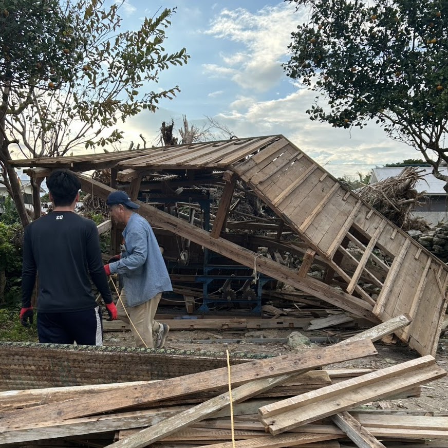 写真は、数年前の台風で傾いた危険倉庫(元大島紬工場)の解体作業の様子です。